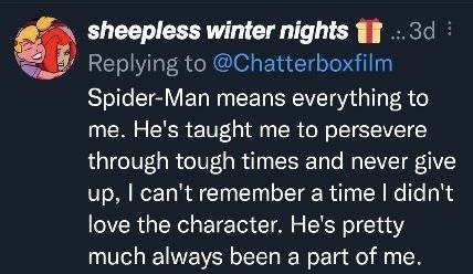 I proposed this type of question to people on Twitter: ‘how has Spider-Man impacted your life?‘ and What does Spider-Man mean to you?