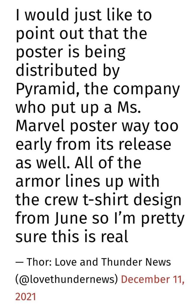 Is there an indication that it’s official? A fan page claims they think it’s real. The poster is being distributed by Pyramid; the same company that released an official poster too early for Ms. Marvel. The suit designs for Thor line up with this poster too.